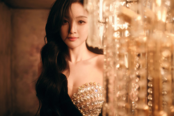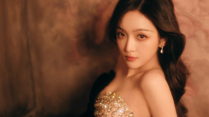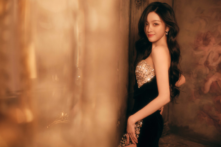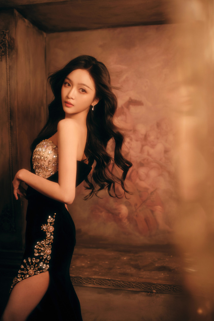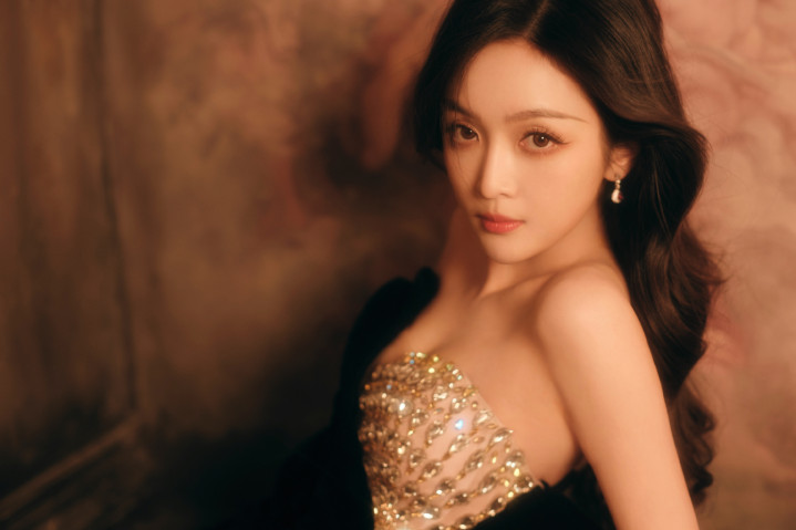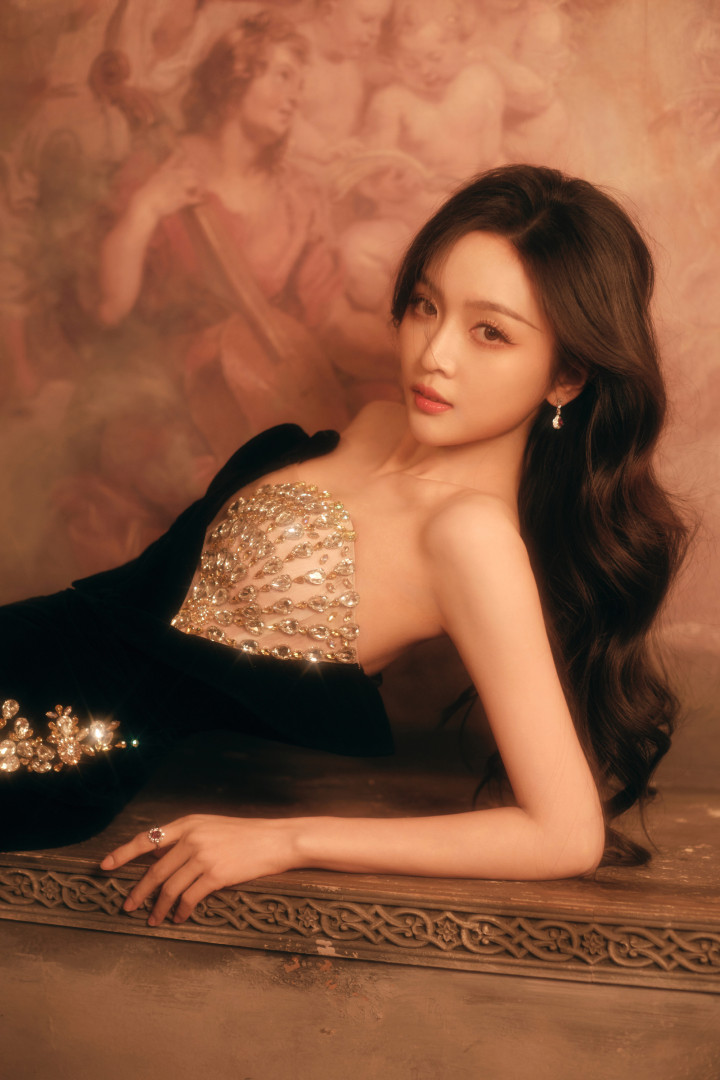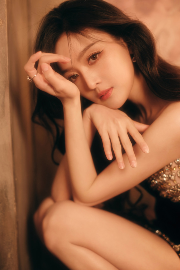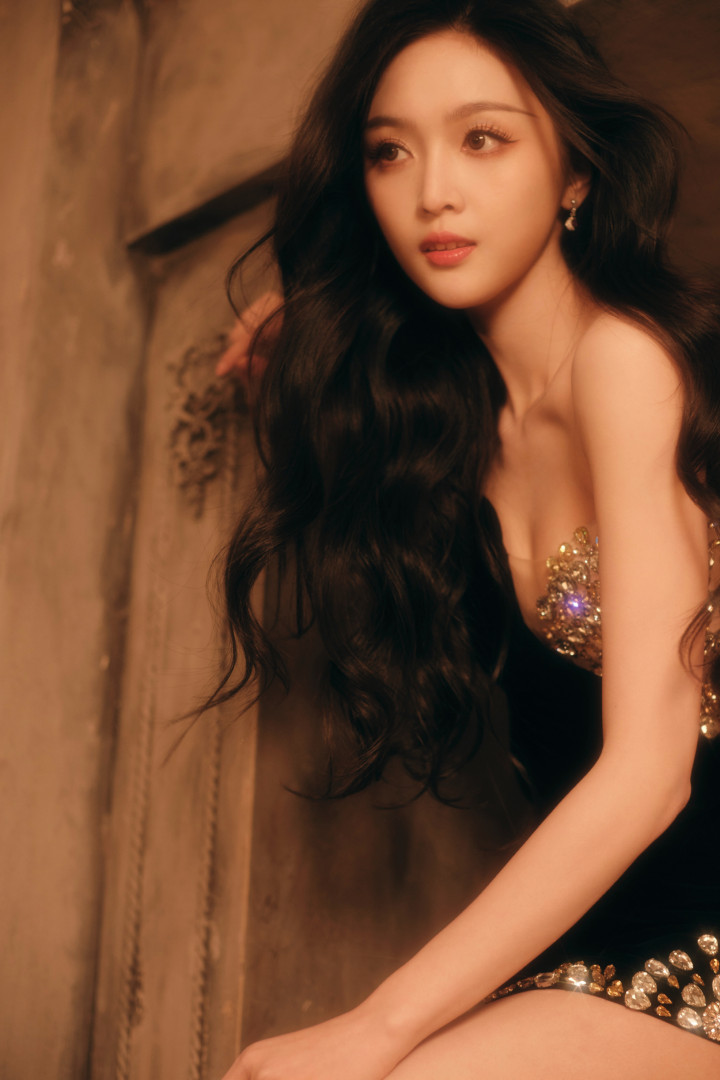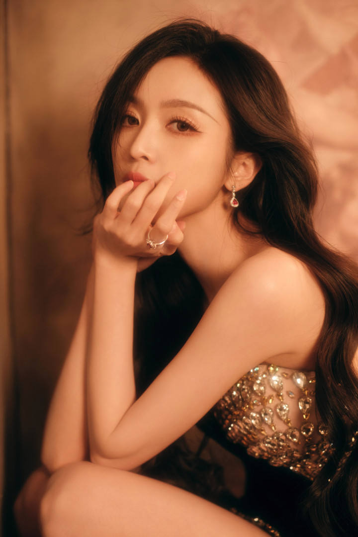 吴宣仪身着闪亮露肩装,长发自然散落,单手托腮,另一手搭于腿上,姿态妩媚。妆容精致,眼神魅惑,背景为暖棕色,整体氛围优雅迷人。