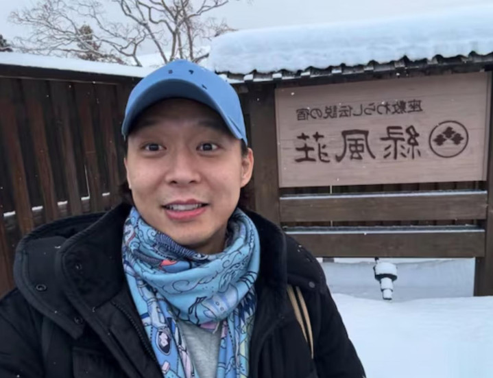 照片中,他正在日本享受当地的拉面与啤酒,看起来心情轻松,生活自在。