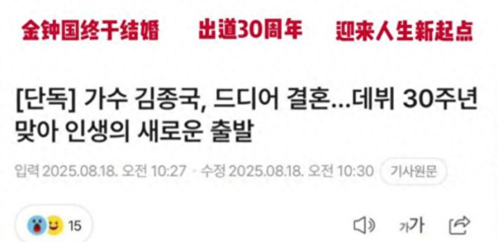 韩媒8月18日消息,歌手金钟国官宣结婚啦!婚礼会在首尔某地非公开举行,只邀请家人和亲近的友人。经纪公司表示:“在出道30周年这一有意义的年份迎来新的起点,更加特别而有意义。希望大家能以温暖的心意给予支持与祝福。”