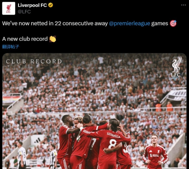 利物浦官方写道:“我们已经连续第22场在英超客场比赛中取得进球,创下了俱乐部新纪录!”