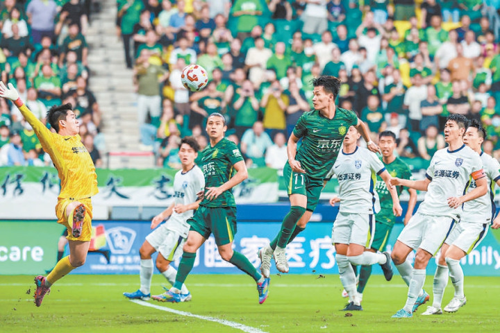 下图:比赛中,国安队球员林良铭头球破门。本报记者潘之望摄