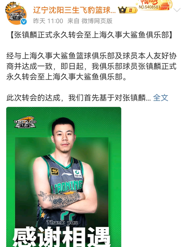 另一笔交易是辽宁男篮核心球员之一张镇麟,他被球队送往上海久事男篮。