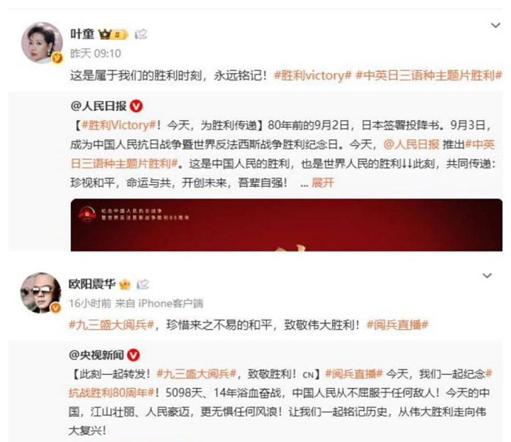 叶童,马浚伟,TWICE,胡杏儿,欧阳震华,王嘉尔,卢靖姗等人都迅速转发,力挺我们祖国。