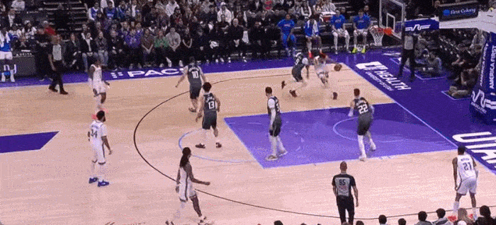 三分线假投篮 突破到内线上篮命中(防他的是大个子,同样身高的人完全跟不上他的速度)