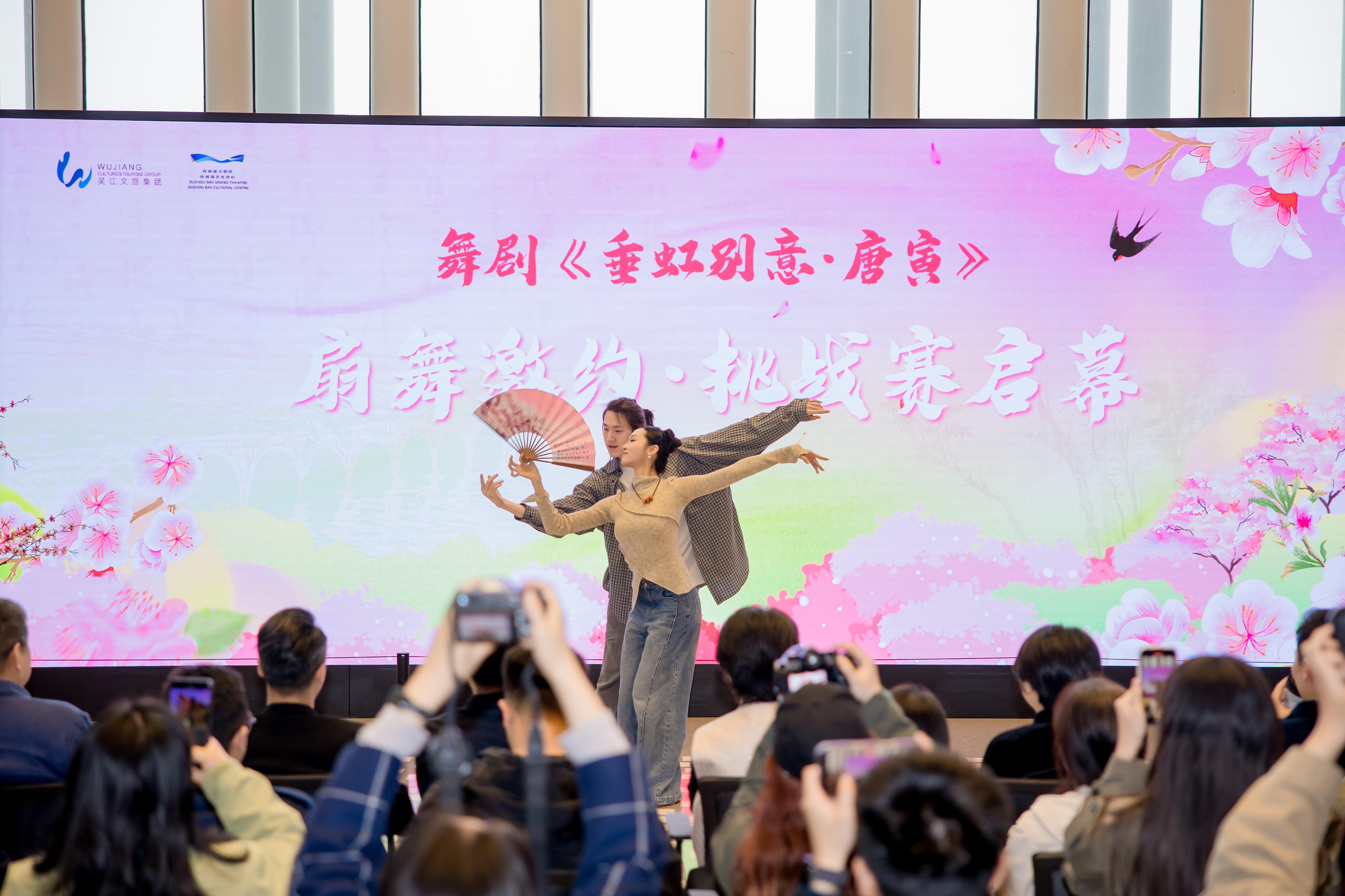 舞剧《垂虹别意·唐寅》中唐寅与沈九娘初见时的双人扇子舞,曾在社交平台上引发广泛传播。发布会上,“垂虹别意扇子舞挑战赛”正式启动,将这段备受关注的舞蹈从剧场引入社交平台。网友在社交平台上发布符合条件的视频即有机会赢取相关奖励。