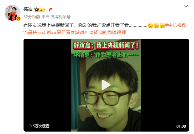 8月7日,@杨迪发视频表示:“刚刚听朋友说我上央视新闻了,我来看看,这种机会很难得诶。”点开发现是因为之前干吃蒙脱石散上的新闻后,杨迪苦笑不得:“第一次以这种方式上央视新闻。”最后还提醒大家一定要谨遵医嘱,一定要认真看说明书。