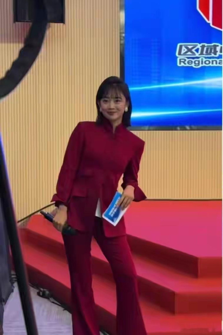 那天她穿起了红色中式服装,她拿着手卡和麦克风的模样自信又漂亮。