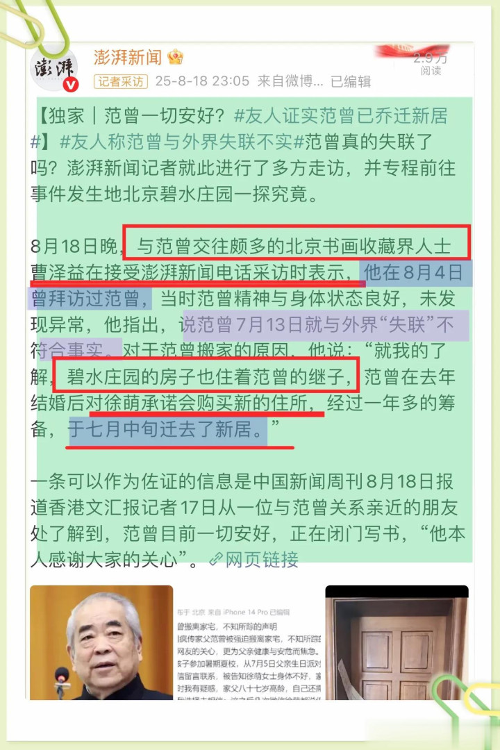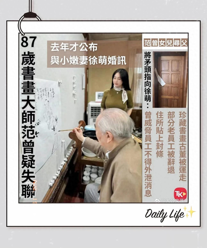 范曾女儿文中也提到,徐萌7.13号带走范曾,并拿走所有生活用品,这么看来,就是搬走了,不是失联!友人说:范曾之前的豪宅继子也在里面住,现在网上都在传徐萌怀孕,网友猜测范曾应该是想带着徐萌两个人好好过日子,安安静静的把宝宝生下来!