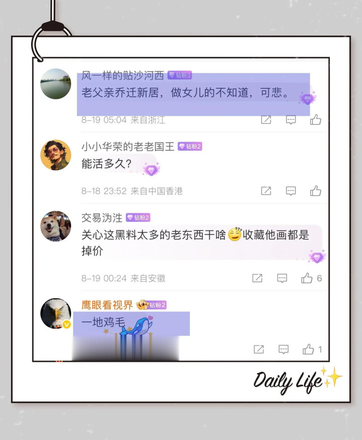 不少网友留言,父亲搬家,女儿居然不知情,也是挺有意思,只是网友质疑徐萌和范曾之间的爱情,现在看来是真爱啊,37岁徐萌愿意为87岁范曾生孩子,范曾为了徐萌买房子,搬家!
