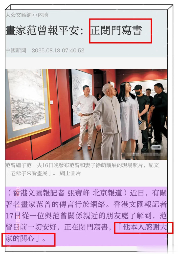 随后有媒体采访了范曾书画圈一位友人,友人也证实范曾没失联,不仅如此这位友人还在8.4号的时候见了范曾,看来二人关系不错,该友人透露范曾去年4月份与徐萌结婚时曾保证会给徐萌买房子,老爷子说到做到,两个人上个月乔迁新居!