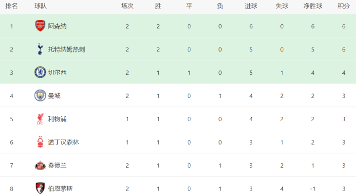 在积分榜上,阿森纳2战全胜,拿到6分排名榜首。击败曼城的热刺同样是6分,排名第2。切尔西1胜1平,拿到4分,排名第3。曼城和利物浦都拿3分,不过利物浦只踢了1场。拿3分的球队还有诺丁汉森林、桑德兰、伯恩茅斯、布伦特福德、伯恩利和利兹联。