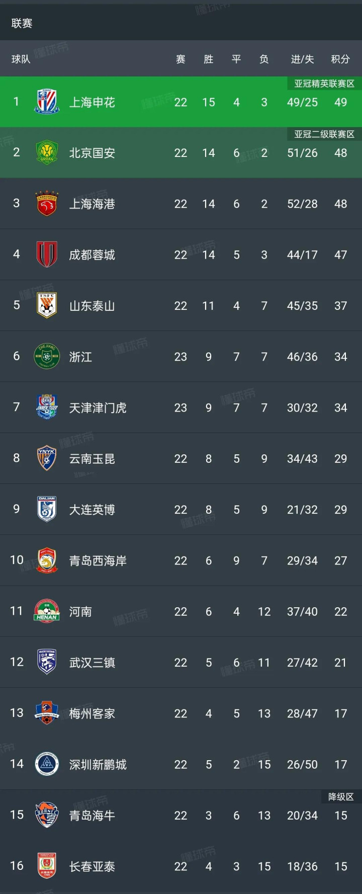 在中超积分榜上,上海申花以49分排在第一位,北京国安和上海海港同积48分,以净胜球的优势排在第二位,上海海港排在第三位,目前中超积分榜前三位只差1分,竞争相当激烈。另外,成都蓉城47分排在第四位,也仅仅落后领头羊2分。