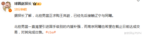 不过,根据媒体人赵探长的报道,北控男篮正求购王岚嵚,已经先后接触辽宁与同曦。