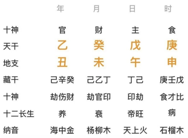 乾造:乙丑年,癸未月,戊午日,庚申时(子丑空)