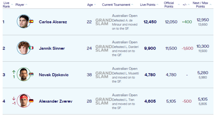 如果周五的半决赛,兹维列夫输给阿尔卡拉斯,德约科维奇就将自2024年8月26日以来首次世界排名重返世界前三。