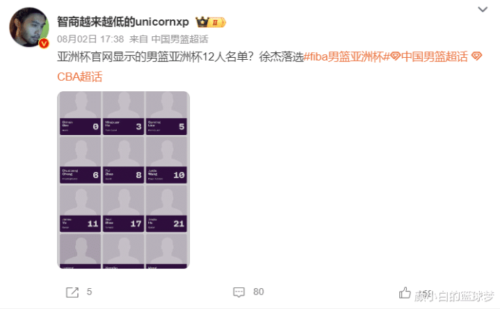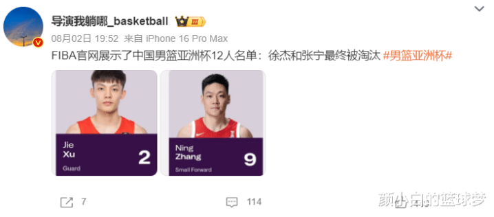 紧接着媒体人导演我躺哪就跟踪报道,FIBA官方显示中国男篮亚洲杯12人名单——徐杰、张宁最终被淘汰,这条推文已经超过440点赞、110条评论,大多数的球迷都不理解为何徐杰、张宁两人为何会落选,高诗岩、李祥波是如何进入最后大名单的。