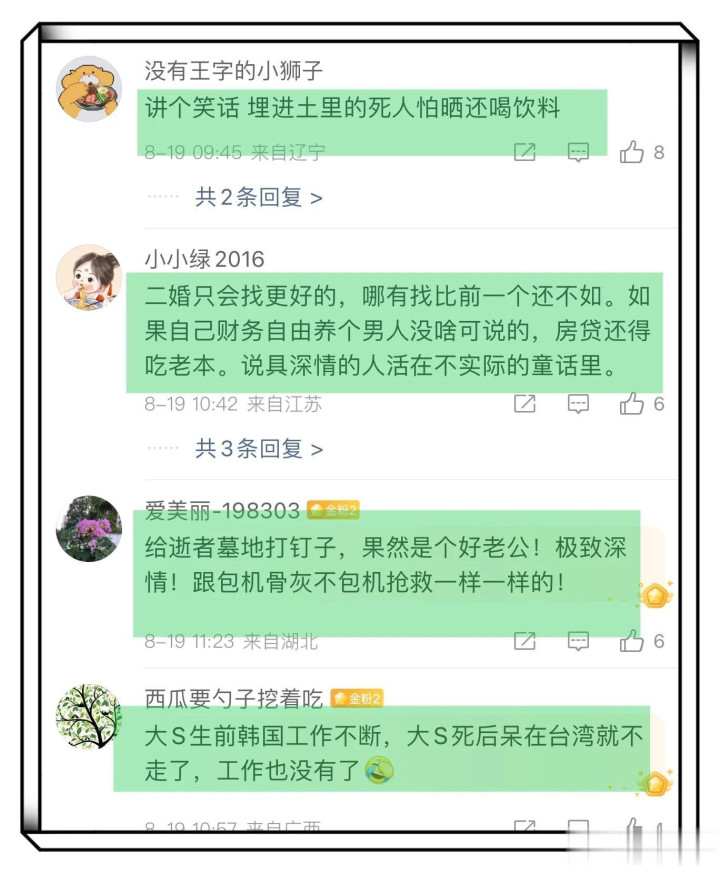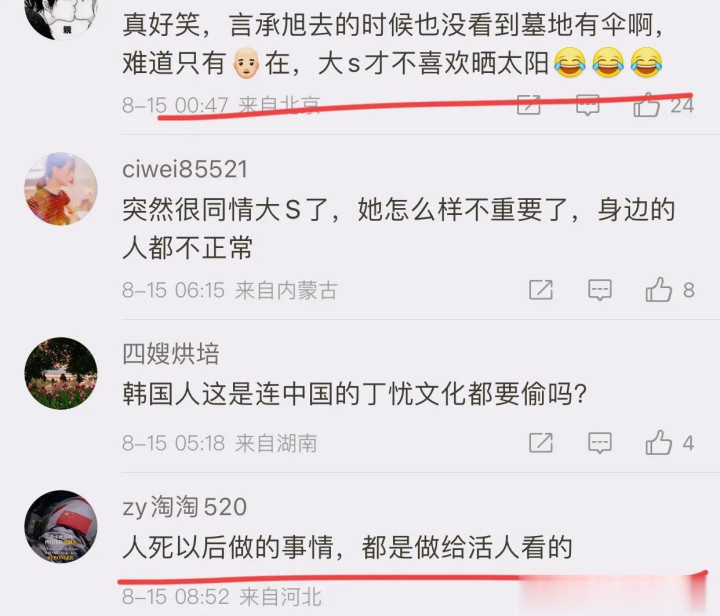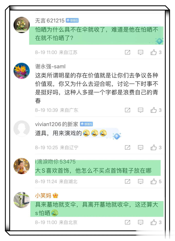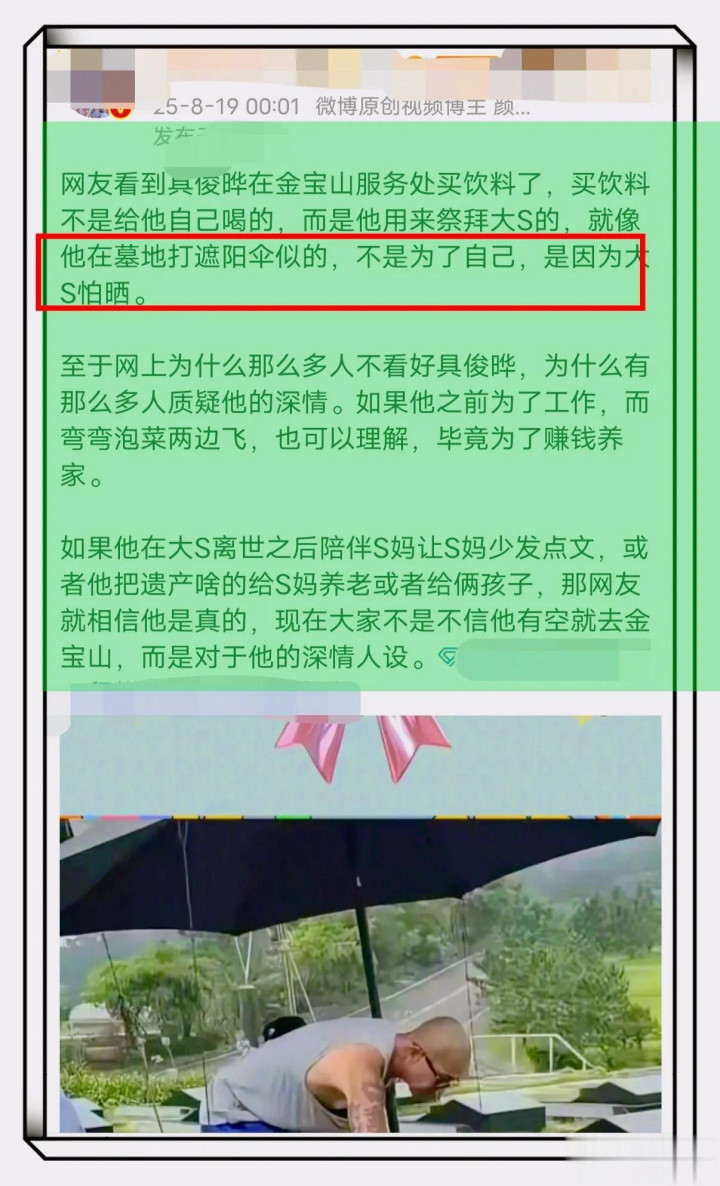 不仅如此,网友还称具俊晔打的遮阳伞大家都以为是他光头,坐的时间久怕太阳晒的太厉害,所以他才打伞,其实不是,该网友称具俊晔去墓地打伞是因为心爱的熙媛怕晒,都知道大S生前最怕晒太阳,与汪小菲结婚的时候还专门选择阴天,大S跟具俊晔在一起的时候,两个人也是不会在外面逛街合影,都是在电梯里,因为她是美容大王,她注重美白,怕太阳!