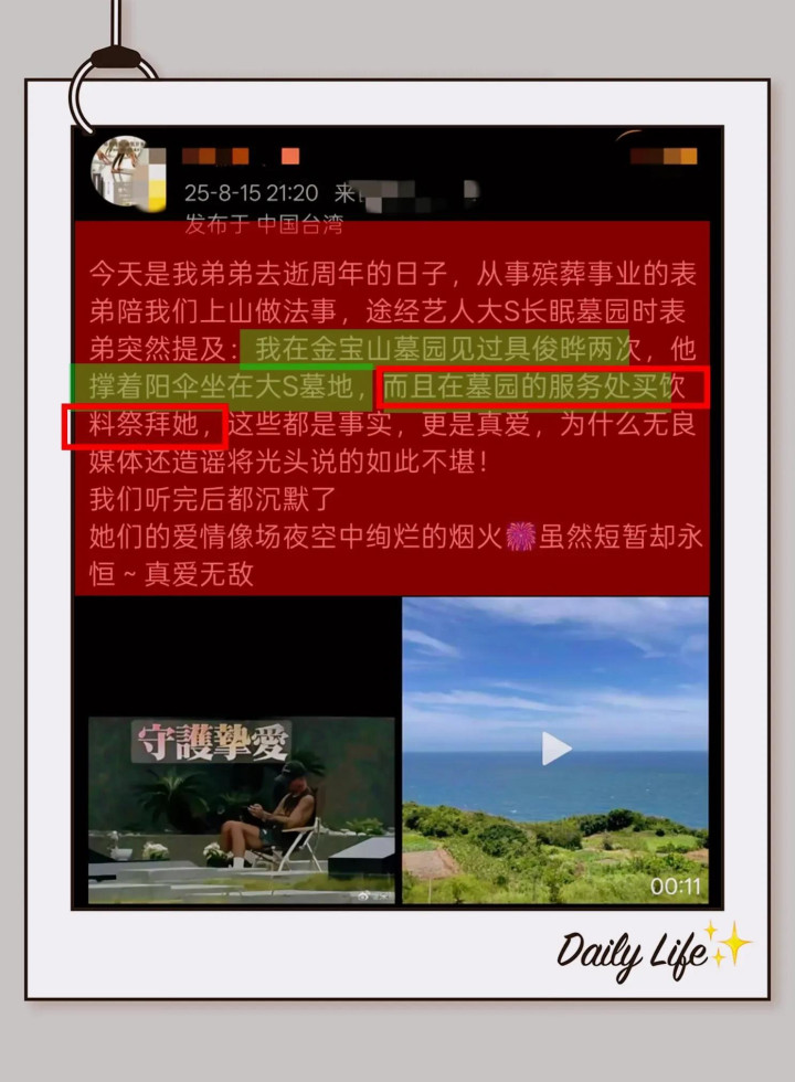 具俊晔又被偶遇了,有网友去金宝山祭拜家人的时候,竟然偶遇了具俊晔去看望大S,据博主讲述,具俊晔还在金宝山的小卖部为大S买了她爱喝的饮料,之前网友在大S墓地前偶遇具俊晔的时候,大S墓碑上都放着一瓶饮料!