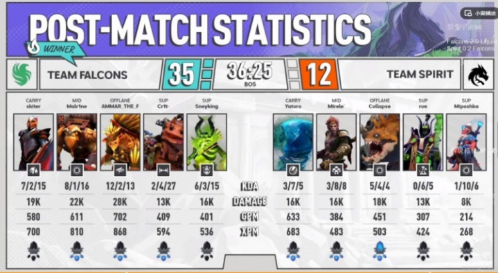 [34分钟]Falcons拿下肉山,skiter龙骑士直接带盾推高顺手再秒一次拉比克!下路跳树的Mirele大圣直接被Malr1ne牛头单杀!Falcons抱团拆完两路,Yatoro水人单人偷家被Malr1ne牛头防住被迫TP回家,正面Mirele大圣开着BKB还是被Falcons追杀而死回不到高地!Spirit双大哥交出买活想打,虽然Malr1ne牛头倒地,但是Mirele大圣根本活不下来,ATF钢背兽贴脸强杀Yatoro水人买活死!Spirit敲出GG!Falcons横扫夺冠,完成世界杯决赛的复仇!