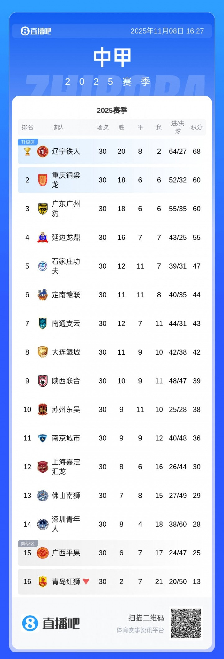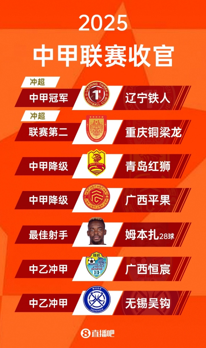 直播吧11月08日讯2025赛季中甲联赛收官,辽宁铁人夺冠携手重庆铜梁龙升入中超,广州广州豹最终排名第三收官,青岛红狮和广西平果降级。