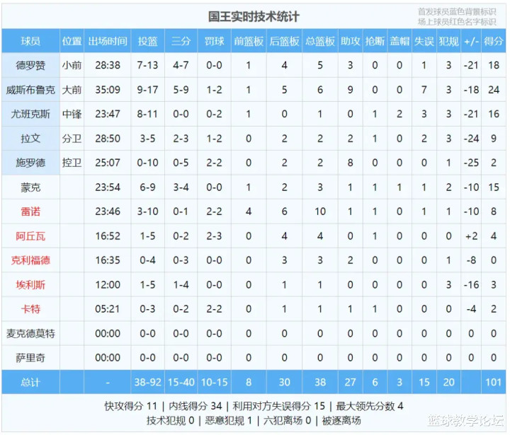 下半场雷霆对威少针对性防守,一突破就有2-3人包夹,切断他的传球路线,导致威少失误增多。威少本场正负值-18,已经是国王首发当中最高的。NBA杯除了决赛,其余也算常规赛战绩。雷霆9胜1负领跑联盟,国王3胜6负西部第12。