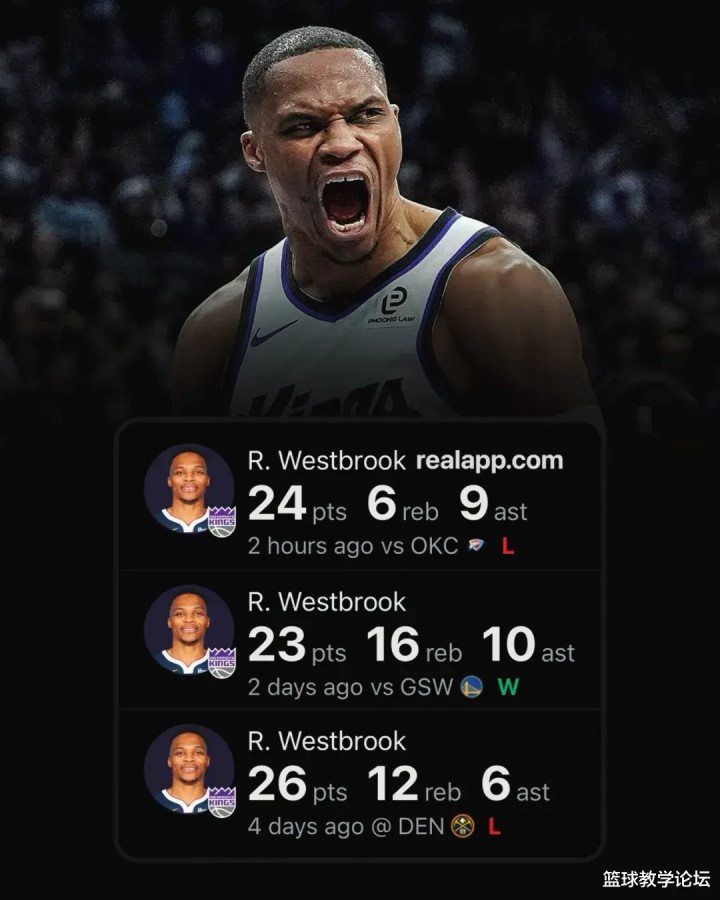 很多球迷可能不知道,威少在国王打得是首发大前锋。来看看国王本场首发阵容:控卫施罗德、分卫拉文、小前锋德罗赞、大前锋威少、中锋尤班克斯。最近三场比赛,威少分别砍下26分12板6助;23分16板10助;24分6板9助。